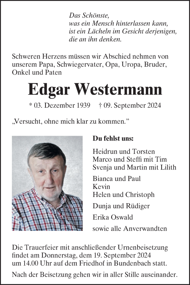Hier finden Sie alle Traueranzeigen aus der Zeitung, die bisher für Edgar Westermann erschienen sind. Weitere Traueranzeigen, die in der Zeitung erscheinen, werden hier ebenfalls aufgelistet