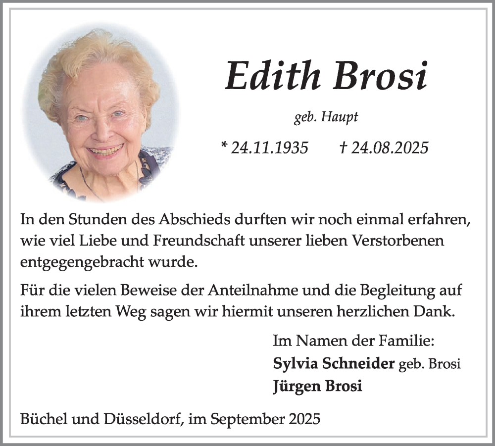 Hier finden Sie alle Traueranzeigen aus der Zeitung, die bisher für Edith Brosi erschienen sind. Weitere Traueranzeigen, die in der Zeitung erscheinen, werden hier ebenfalls aufgelistet