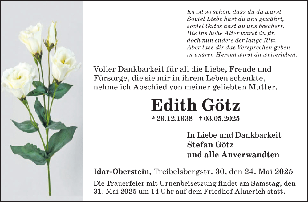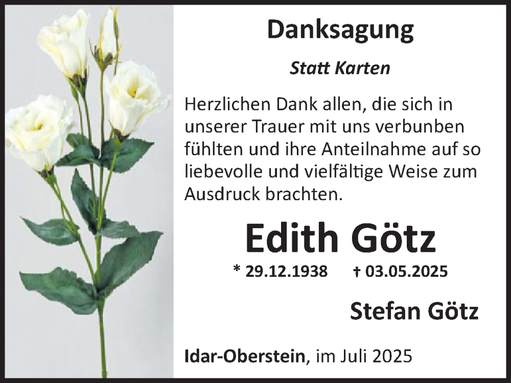 Hier finden Sie alle Traueranzeigen aus der Zeitung, die bisher für Edith Götz erschienen sind. Weitere Traueranzeigen, die in der Zeitung erscheinen, werden hier ebenfalls aufgelistet