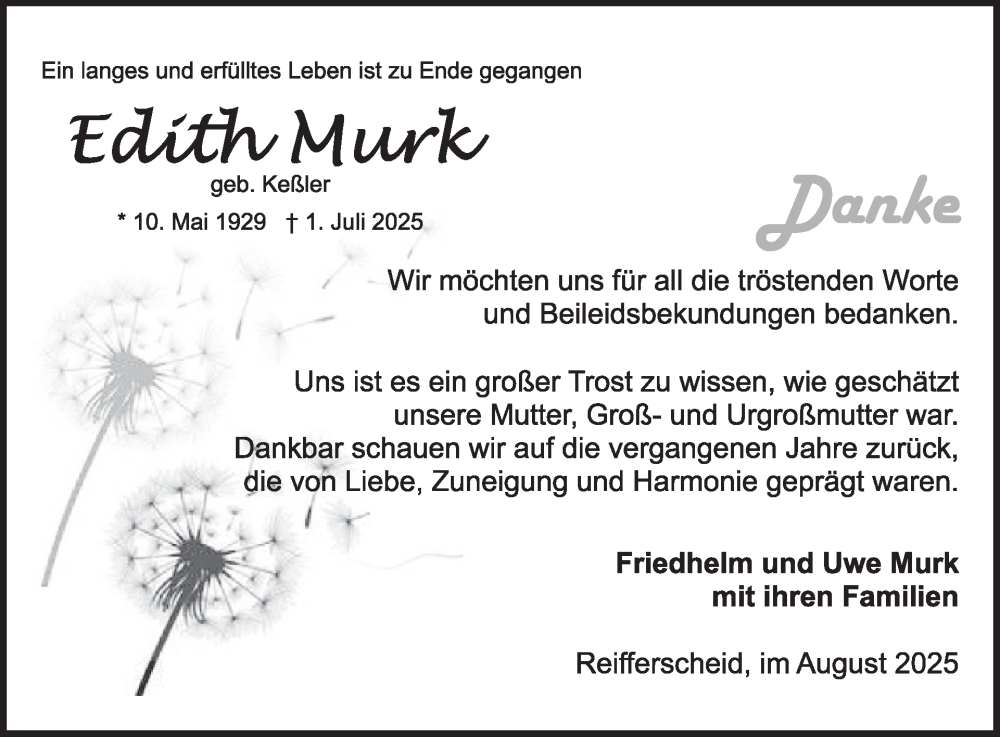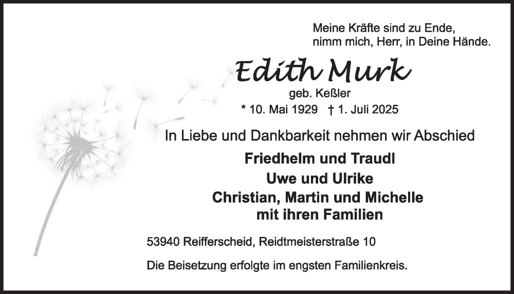 Hier finden Sie alle Traueranzeigen aus der Zeitung, die bisher für Edith Murk erschienen sind. Weitere Traueranzeigen, die in der Zeitung erscheinen, werden hier ebenfalls aufgelistet