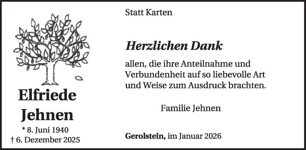 Hier finden Sie alle Traueranzeigen aus der Zeitung, die bisher für Elfriede Jehnen erschienen sind. Weitere Traueranzeigen, die in der Zeitung erscheinen, werden hier ebenfalls aufgelistet