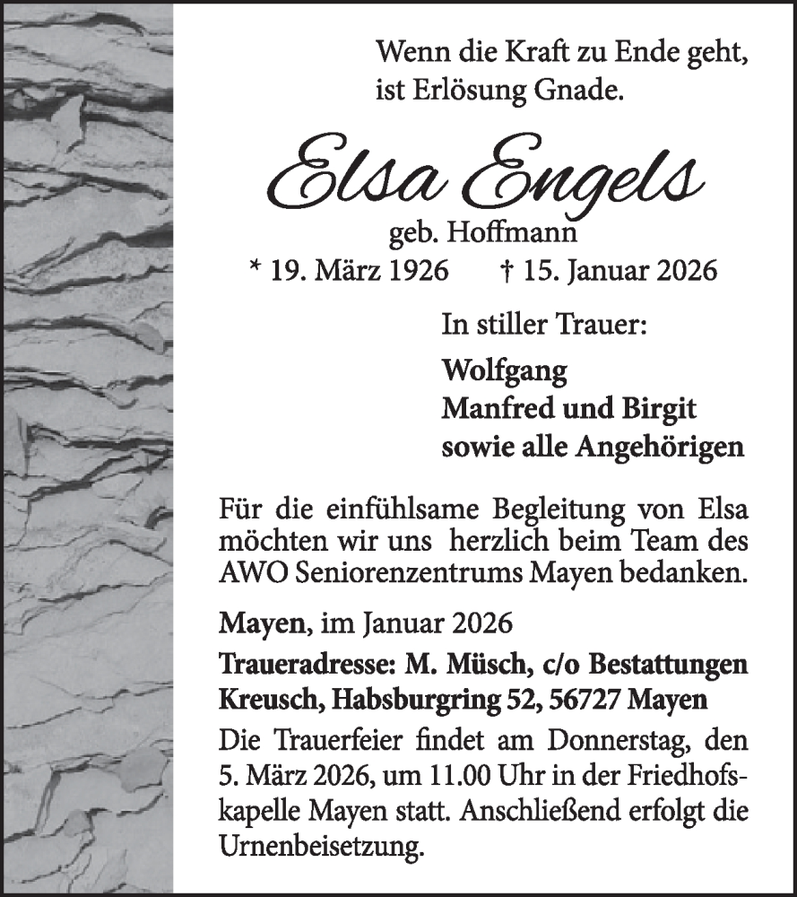 Hier finden Sie alle Traueranzeigen aus der Zeitung, die bisher für Elsa Engels erschienen sind. Weitere Traueranzeigen, die in der Zeitung erscheinen, werden hier ebenfalls aufgelistet