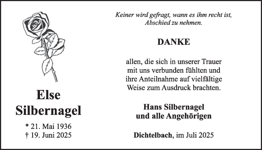 Hier finden Sie alle Traueranzeigen aus der Zeitung, die bisher für Else Silbernagel erschienen sind. Weitere Traueranzeigen, die in der Zeitung erscheinen, werden hier ebenfalls aufgelistet