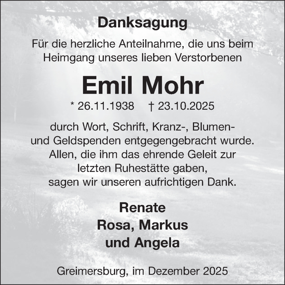 Hier finden Sie alle Traueranzeigen aus der Zeitung, die bisher für Emil Mohr erschienen sind. Weitere Traueranzeigen, die in der Zeitung erscheinen, werden hier ebenfalls aufgelistet