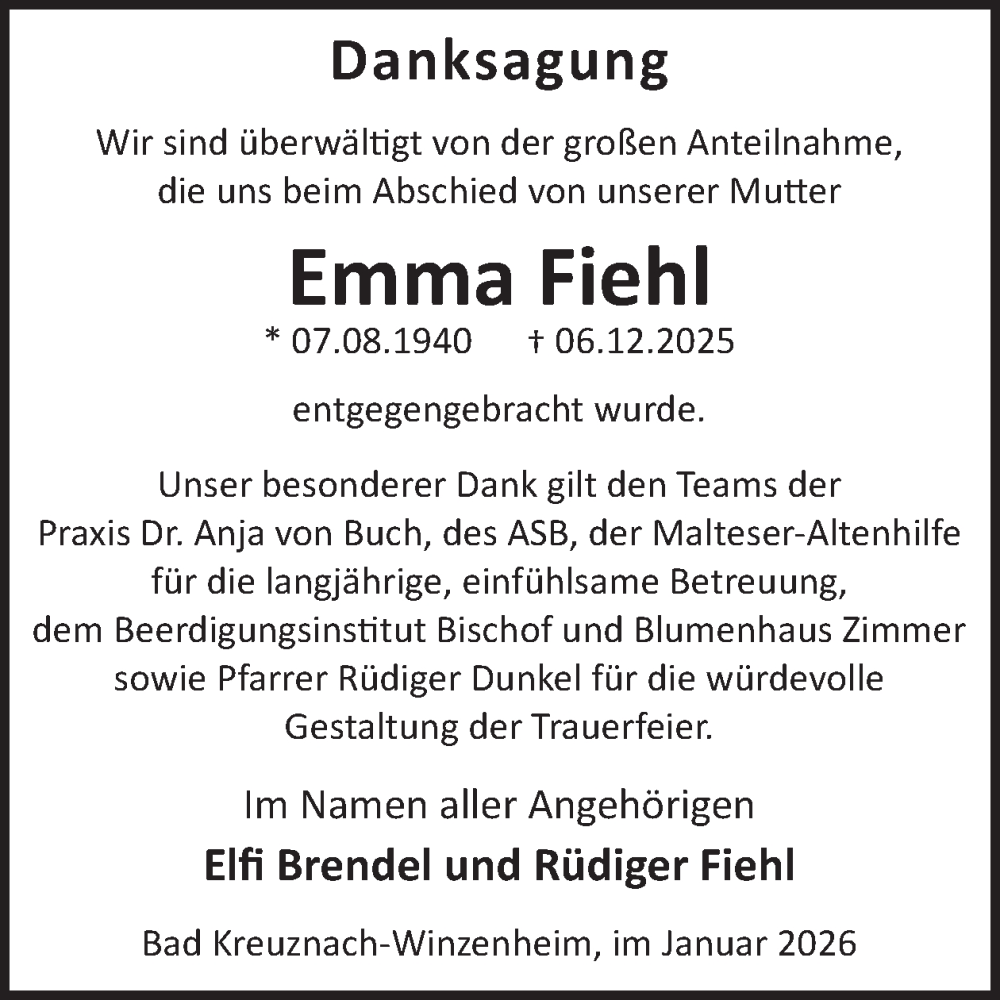 Hier finden Sie alle Traueranzeigen aus der Zeitung, die bisher für Emma Fiehl erschienen sind. Weitere Traueranzeigen, die in der Zeitung erscheinen, werden hier ebenfalls aufgelistet