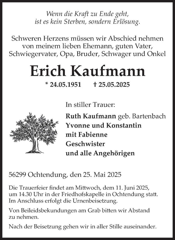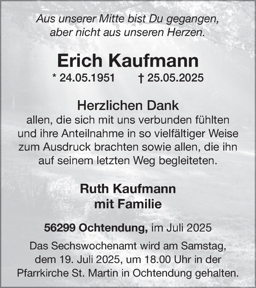 Hier finden Sie alle Traueranzeigen aus der Zeitung, die bisher für Erich Kaufmann erschienen sind. Weitere Traueranzeigen, die in der Zeitung erscheinen, werden hier ebenfalls aufgelistet