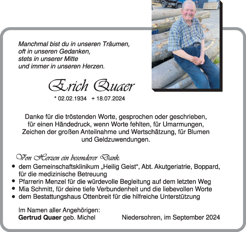 Hier finden Sie alle Traueranzeigen aus der Zeitung, die bisher für Erich Quaer erschienen sind. Weitere Traueranzeigen, die in der Zeitung erscheinen, werden hier ebenfalls aufgelistet