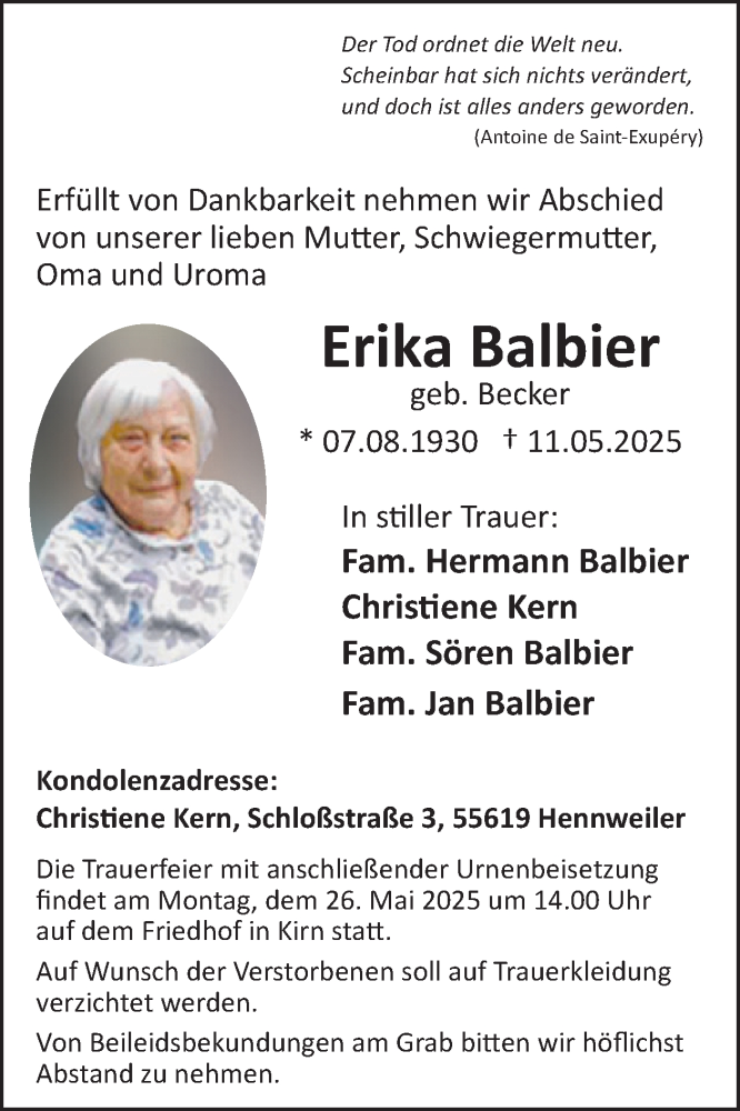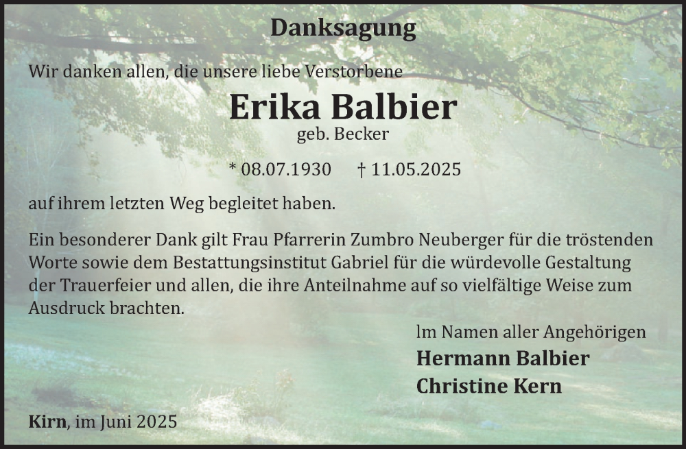 Hier finden Sie alle Traueranzeigen aus der Zeitung, die bisher für Erika Balbier erschienen sind. Weitere Traueranzeigen, die in der Zeitung erscheinen, werden hier ebenfalls aufgelistet