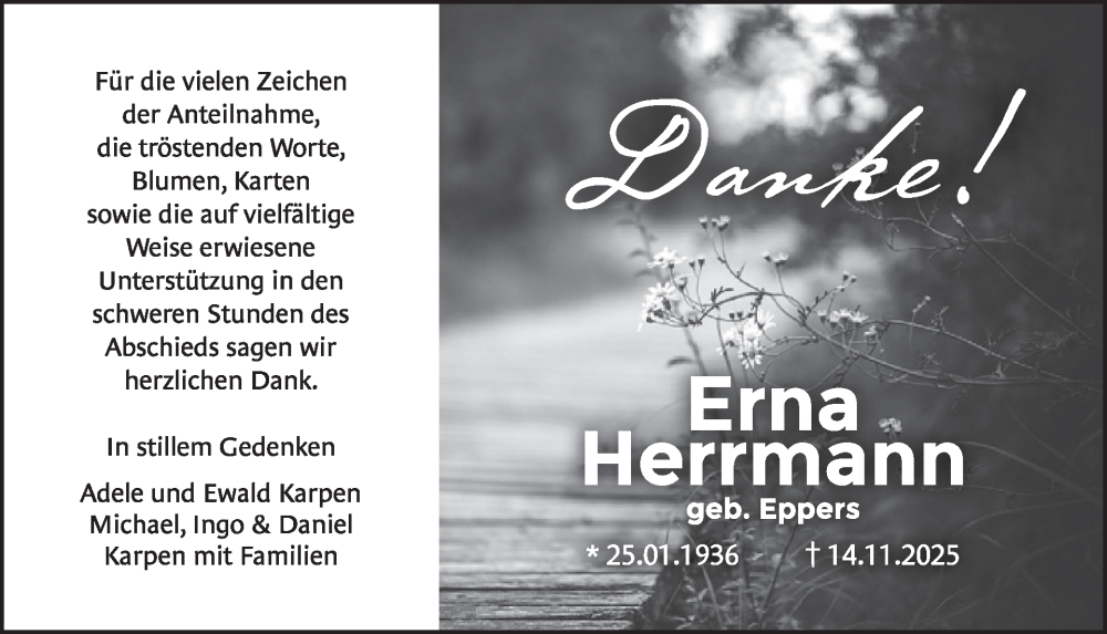Hier finden Sie alle Traueranzeigen aus der Zeitung, die bisher für Erna Herrmann erschienen sind. Weitere Traueranzeigen, die in der Zeitung erscheinen, werden hier ebenfalls aufgelistet