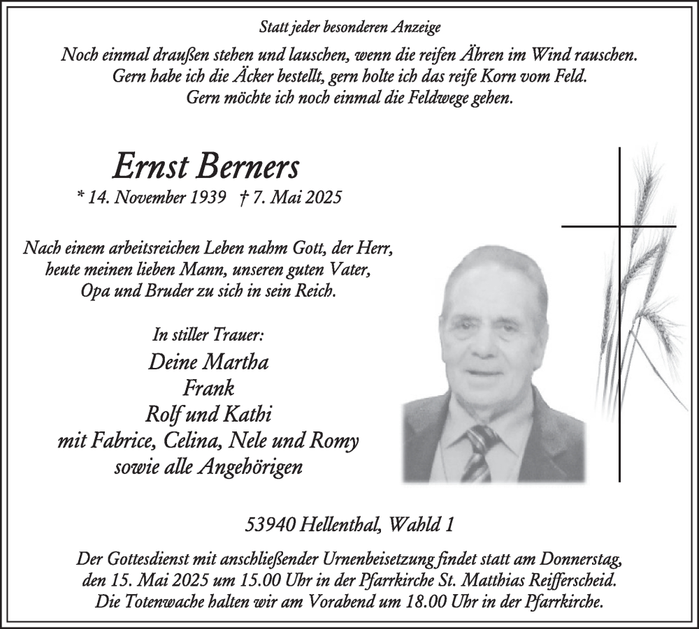 Hier finden Sie alle Traueranzeigen aus der Zeitung, die bisher für Ernst Berners erschienen sind. Weitere Traueranzeigen, die in der Zeitung erscheinen, werden hier ebenfalls aufgelistet