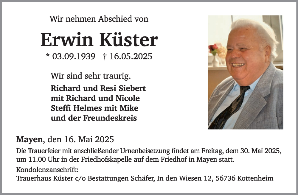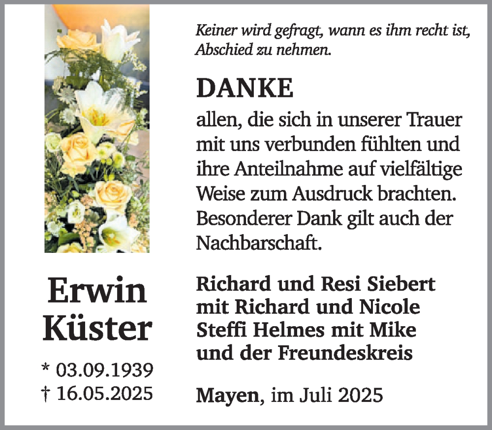 Hier finden Sie alle Traueranzeigen aus der Zeitung, die bisher für Erwin Küster erschienen sind. Weitere Traueranzeigen, die in der Zeitung erscheinen, werden hier ebenfalls aufgelistet