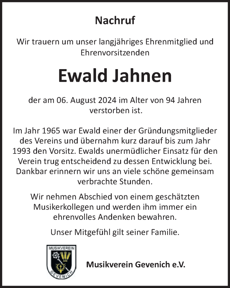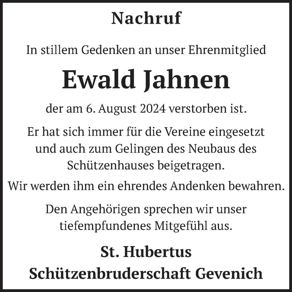 Hier finden Sie alle Traueranzeigen aus der Zeitung, die bisher für Ewald Jahnen erschienen sind. Weitere Traueranzeigen, die in der Zeitung erscheinen, werden hier ebenfalls aufgelistet