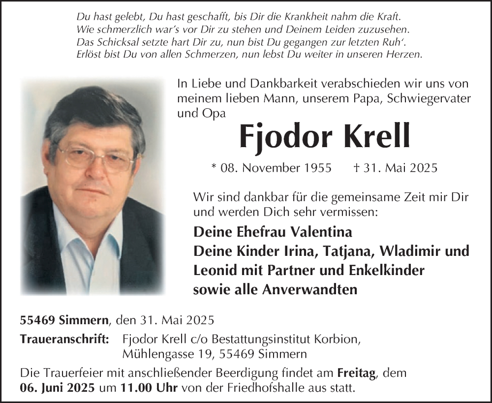 Hier finden Sie alle Traueranzeigen aus der Zeitung, die bisher für Fjodor Krell erschienen sind. Weitere Traueranzeigen, die in der Zeitung erscheinen, werden hier ebenfalls aufgelistet
