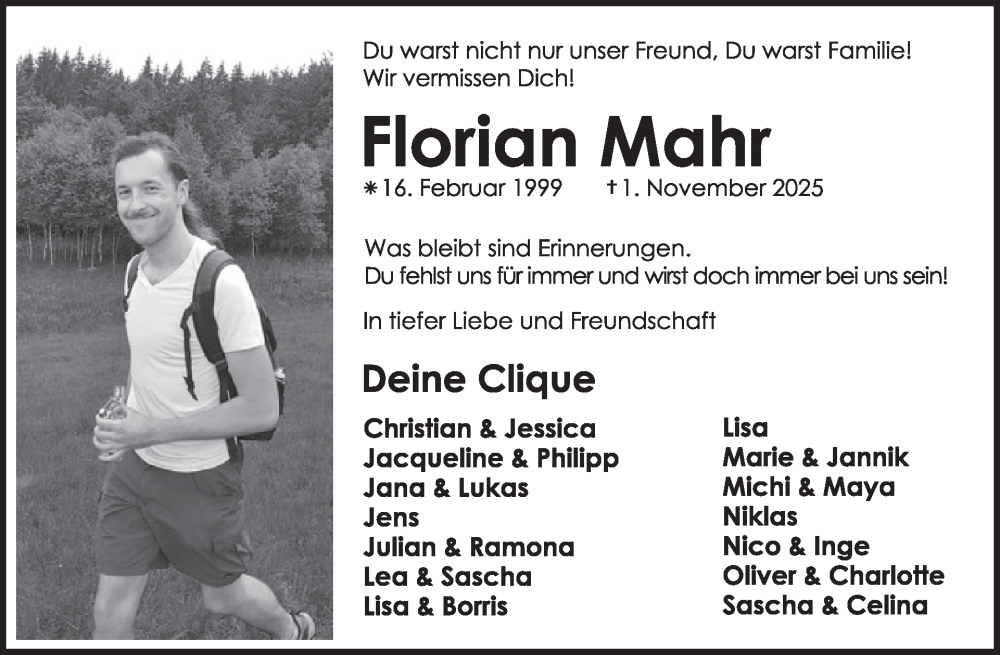 Hier finden Sie alle Traueranzeigen aus der Zeitung, die bisher für Florian Mahr erschienen sind. Weitere Traueranzeigen, die in der Zeitung erscheinen, werden hier ebenfalls aufgelistet