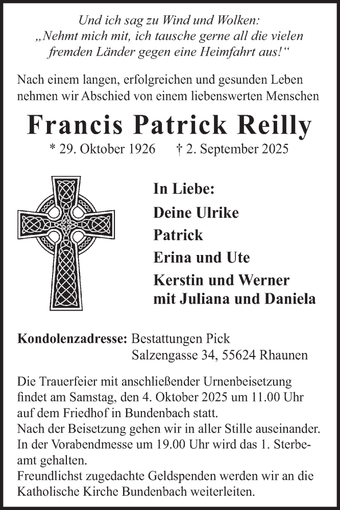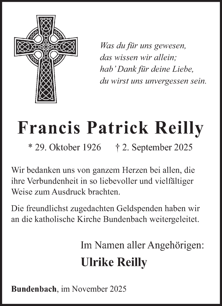 Hier finden Sie alle Traueranzeigen aus der Zeitung, die bisher für Francis Patrick Reilly erschienen sind. Weitere Traueranzeigen, die in der Zeitung erscheinen, werden hier ebenfalls aufgelistet