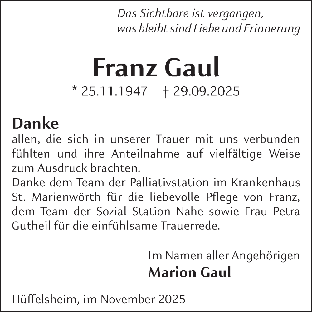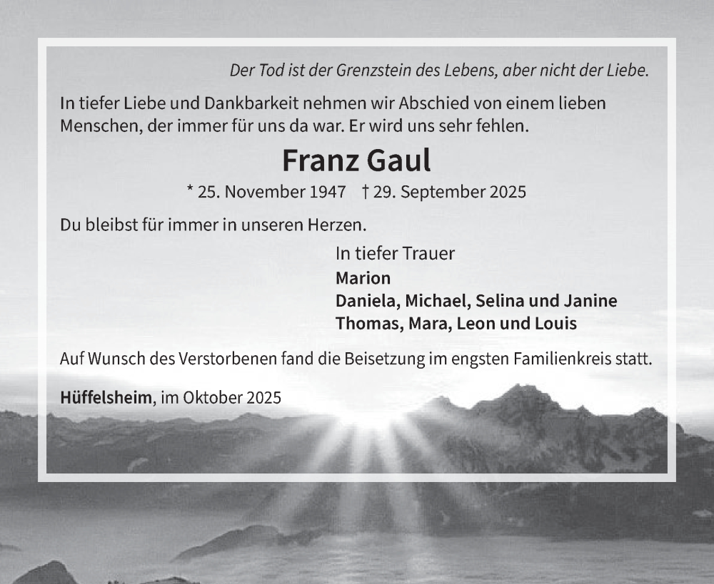 Hier finden Sie alle Traueranzeigen aus der Zeitung, die bisher für Franz Gaul erschienen sind. Weitere Traueranzeigen, die in der Zeitung erscheinen, werden hier ebenfalls aufgelistet