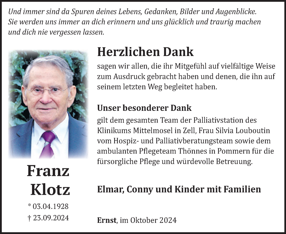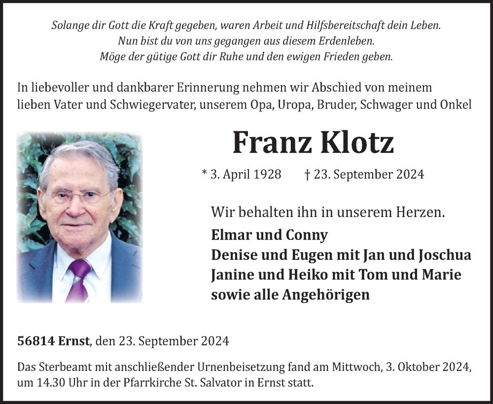 Hier finden Sie alle Traueranzeigen aus der Zeitung, die bisher für Franz Klotz erschienen sind. Weitere Traueranzeigen, die in der Zeitung erscheinen, werden hier ebenfalls aufgelistet