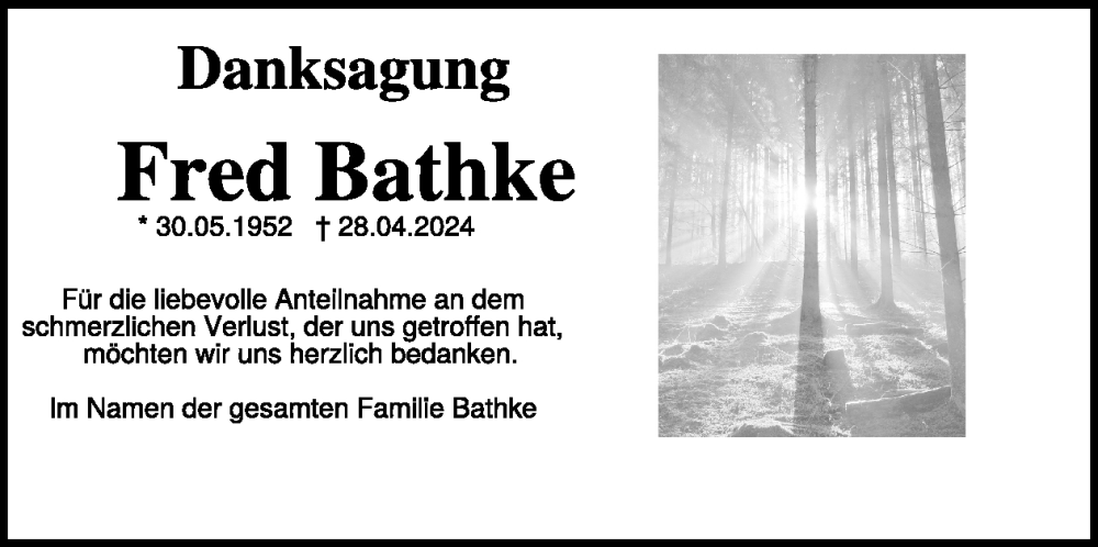 Hier finden Sie alle Traueranzeigen aus der Zeitung, die bisher für Fred Bathke erschienen sind. Weitere Traueranzeigen, die in der Zeitung erscheinen, werden hier ebenfalls aufgelistet