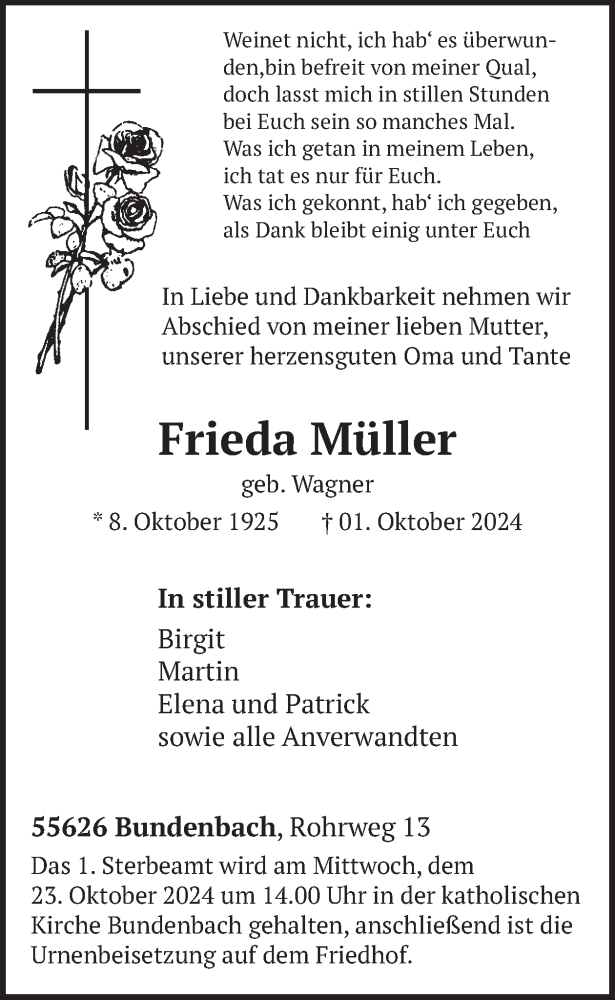 Hier finden Sie alle Traueranzeigen aus der Zeitung, die bisher für Frieda Müller erschienen sind. Weitere Traueranzeigen, die in der Zeitung erscheinen, werden hier ebenfalls aufgelistet