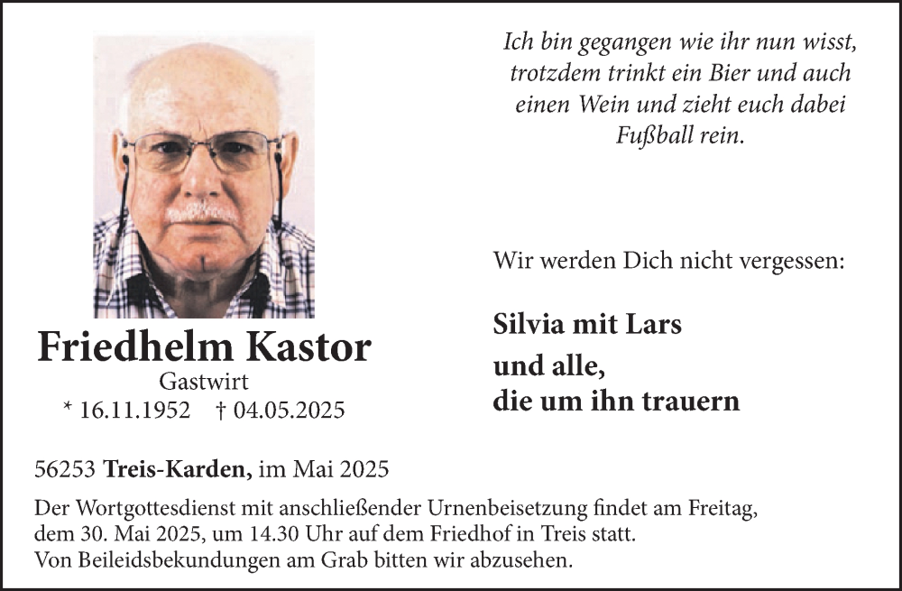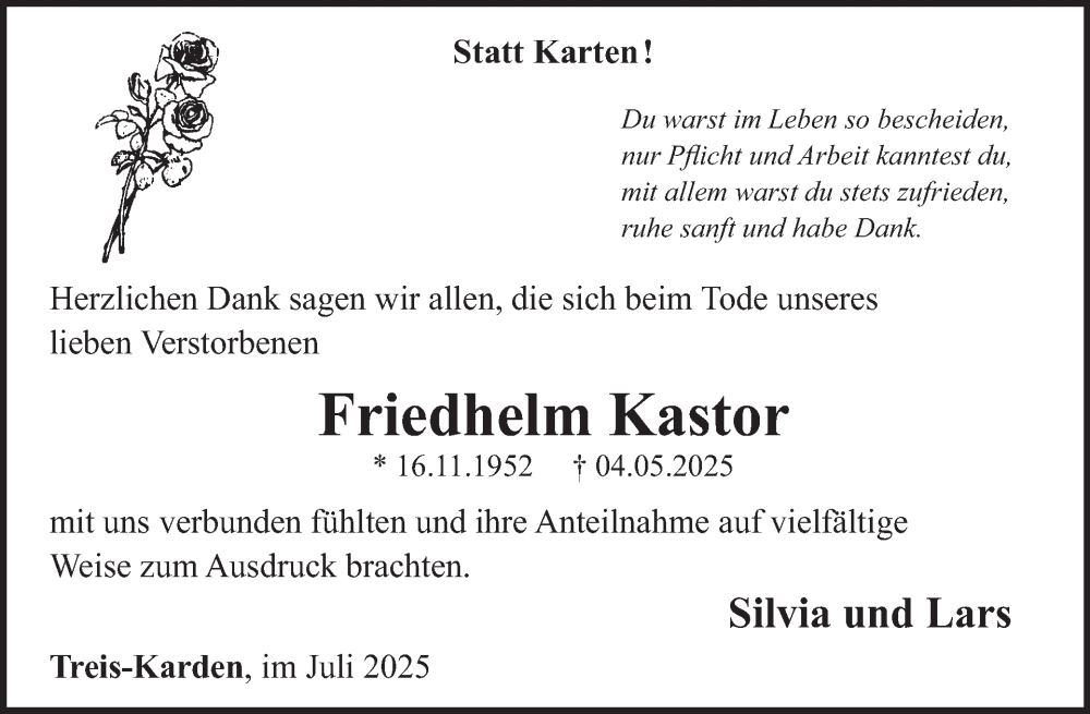 Hier finden Sie alle Traueranzeigen aus der Zeitung, die bisher für Friedhelm Kastor erschienen sind. Weitere Traueranzeigen, die in der Zeitung erscheinen, werden hier ebenfalls aufgelistet