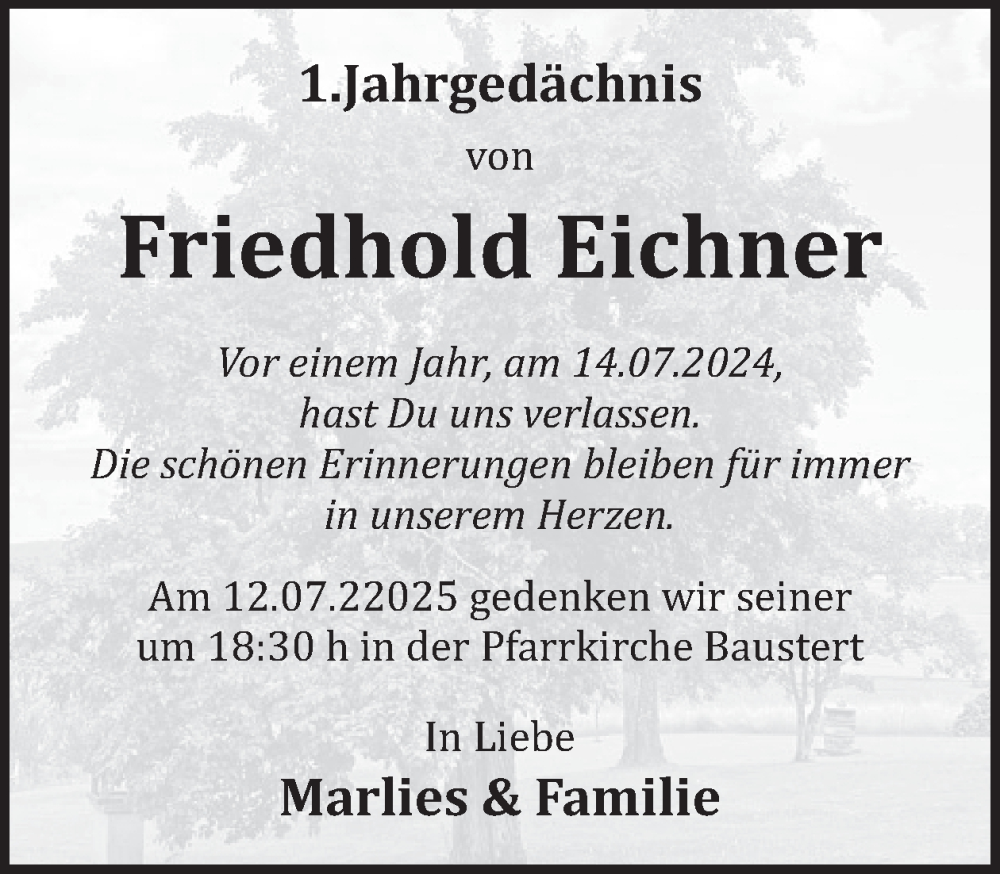 Hier finden Sie alle Traueranzeigen aus der Zeitung, die bisher für Friedhold Eichner erschienen sind. Weitere Traueranzeigen, die in der Zeitung erscheinen, werden hier ebenfalls aufgelistet