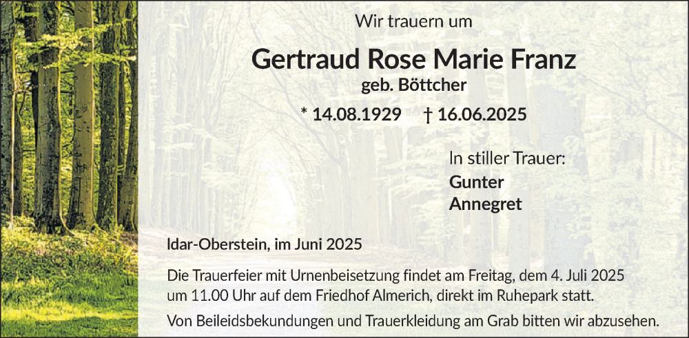 Hier finden Sie alle Traueranzeigen aus der Zeitung, die bisher für Gertraud Rose Marie Franz erschienen sind. Weitere Traueranzeigen, die in der Zeitung erscheinen, werden hier ebenfalls aufgelistet