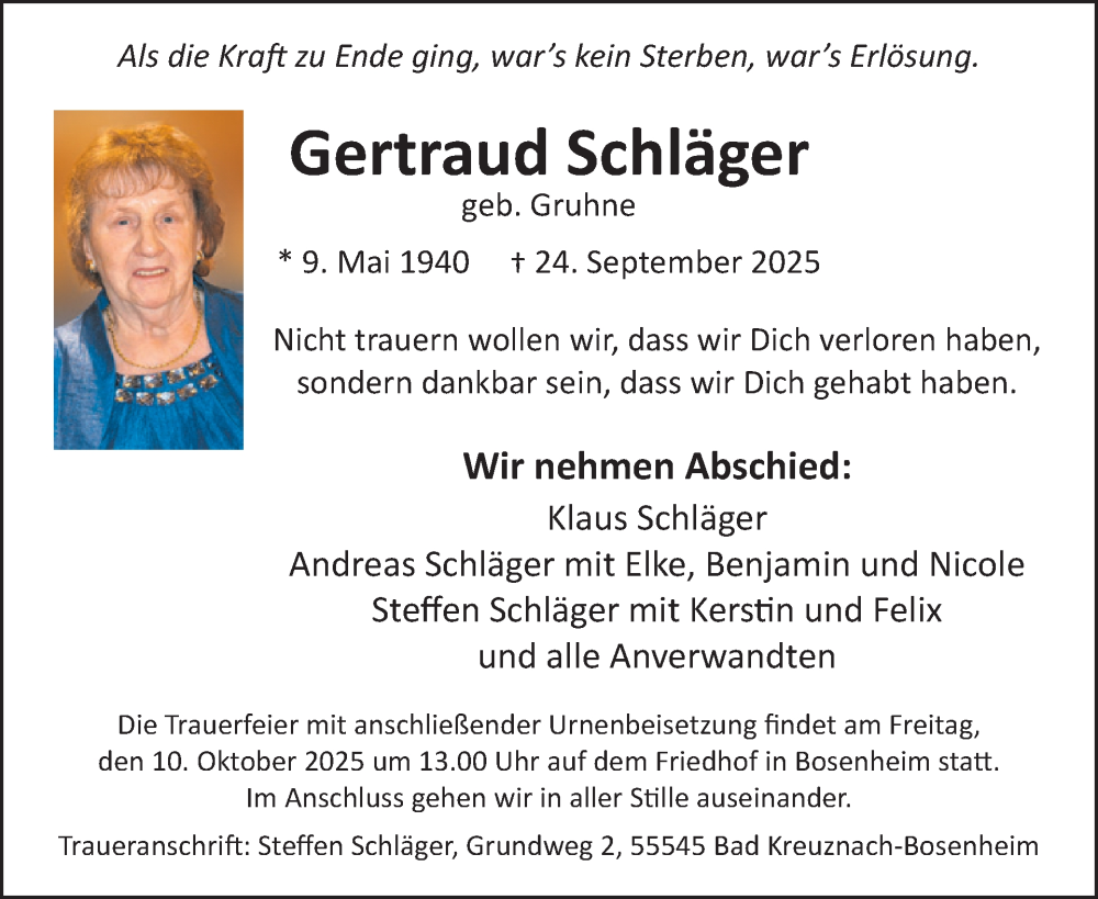 Hier finden Sie alle Traueranzeigen aus der Zeitung, die bisher für Gertraud Schläger erschienen sind. Weitere Traueranzeigen, die in der Zeitung erscheinen, werden hier ebenfalls aufgelistet