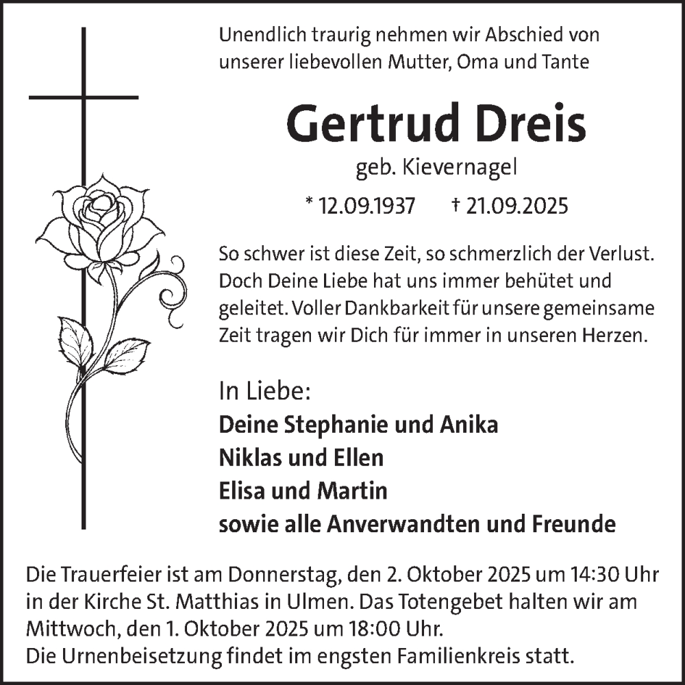 Hier finden Sie alle Traueranzeigen aus der Zeitung, die bisher für Gertrud Dreis erschienen sind. Weitere Traueranzeigen, die in der Zeitung erscheinen, werden hier ebenfalls aufgelistet