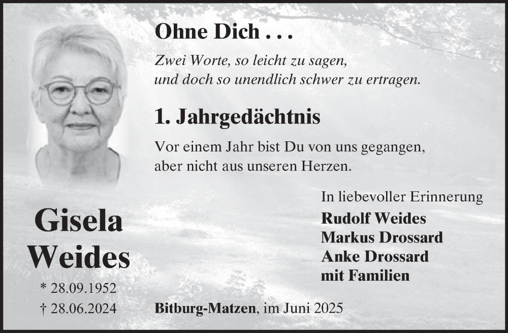 Hier finden Sie alle Traueranzeigen aus der Zeitung, die bisher für Gisela Weides erschienen sind. Weitere Traueranzeigen, die in der Zeitung erscheinen, werden hier ebenfalls aufgelistet