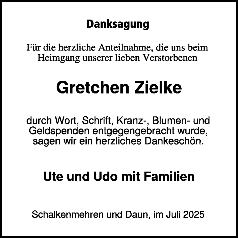 Hier finden Sie alle Traueranzeigen aus der Zeitung, die bisher für Gretchen Zielke erschienen sind. Weitere Traueranzeigen, die in der Zeitung erscheinen, werden hier ebenfalls aufgelistet