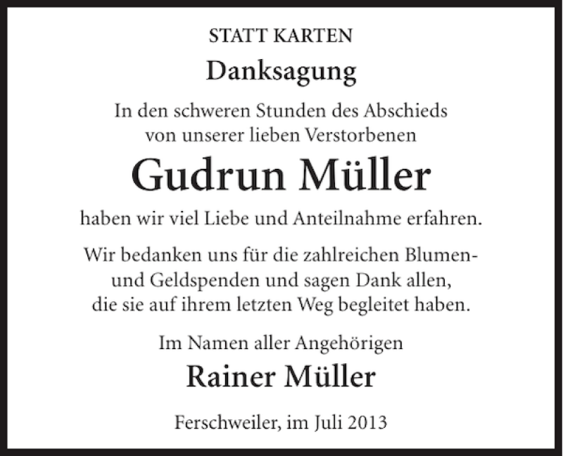 Hier finden Sie alle Traueranzeigen aus der Zeitung, die bisher für Gudrun Müller erschienen sind. Weitere Traueranzeigen, die in der Zeitung erscheinen, werden hier ebenfalls aufgelistet