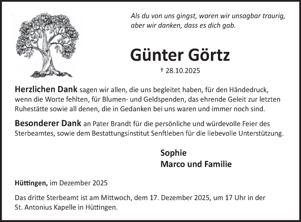 Hier finden Sie alle Traueranzeigen aus der Zeitung, die bisher für Günter Görtz erschienen sind. Weitere Traueranzeigen, die in der Zeitung erscheinen, werden hier ebenfalls aufgelistet
