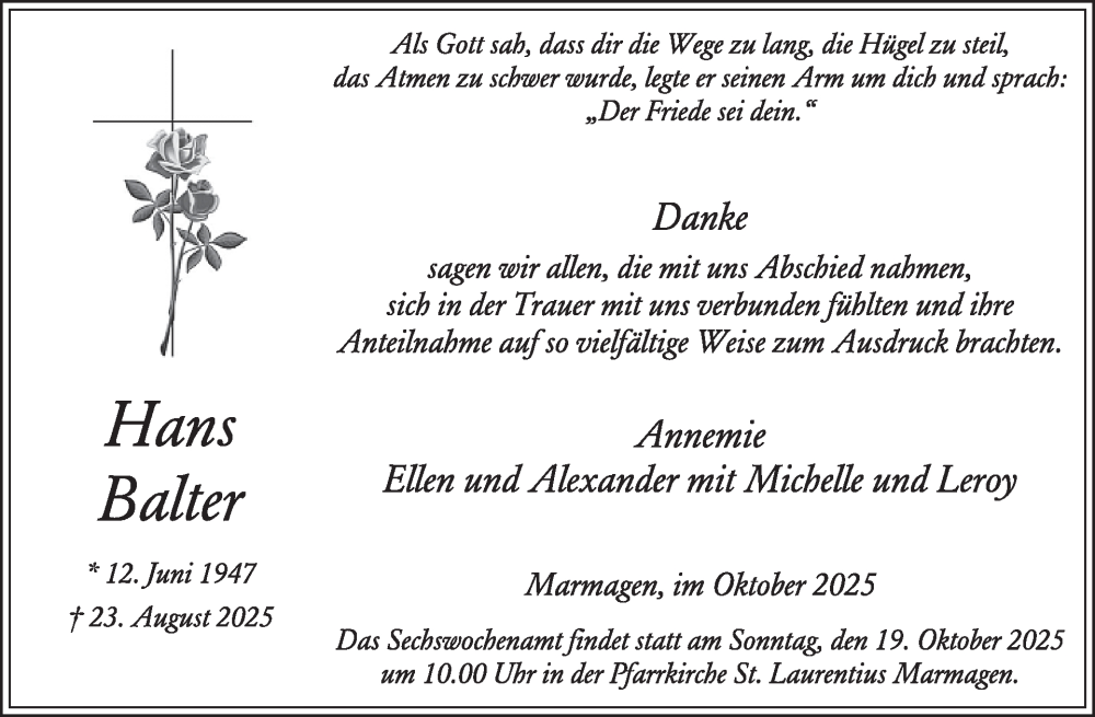 Hier finden Sie alle Traueranzeigen aus der Zeitung, die bisher für Hans Balter erschienen sind. Weitere Traueranzeigen, die in der Zeitung erscheinen, werden hier ebenfalls aufgelistet