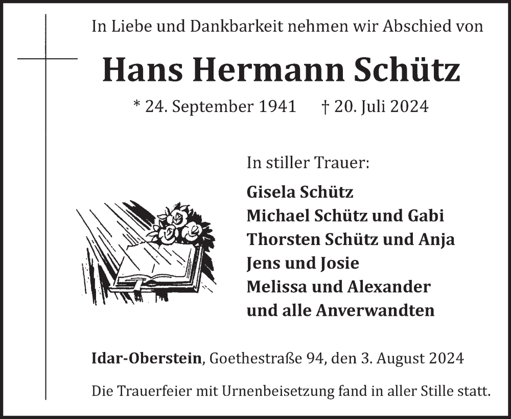 Hier finden Sie alle Traueranzeigen aus der Zeitung, die bisher für Hans Hermann Schütz erschienen sind. Weitere Traueranzeigen, die in der Zeitung erscheinen, werden hier ebenfalls aufgelistet