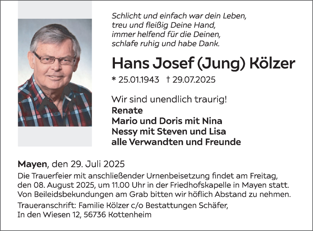 Hier finden Sie alle Traueranzeigen aus der Zeitung, die bisher für Hans Josef Kölzer erschienen sind. Weitere Traueranzeigen, die in der Zeitung erscheinen, werden hier ebenfalls aufgelistet
