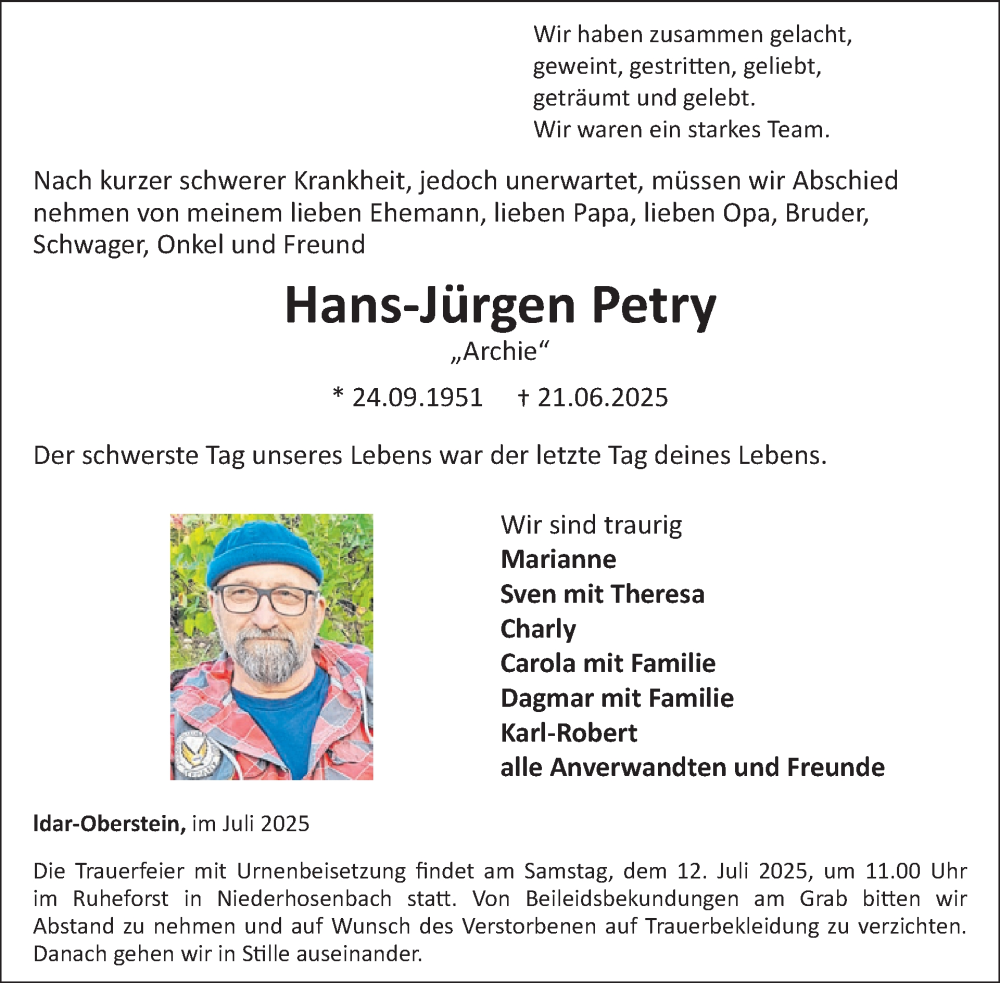 Hier finden Sie alle Traueranzeigen aus der Zeitung, die bisher für Hans-Jürgen Petry erschienen sind. Weitere Traueranzeigen, die in der Zeitung erscheinen, werden hier ebenfalls aufgelistet