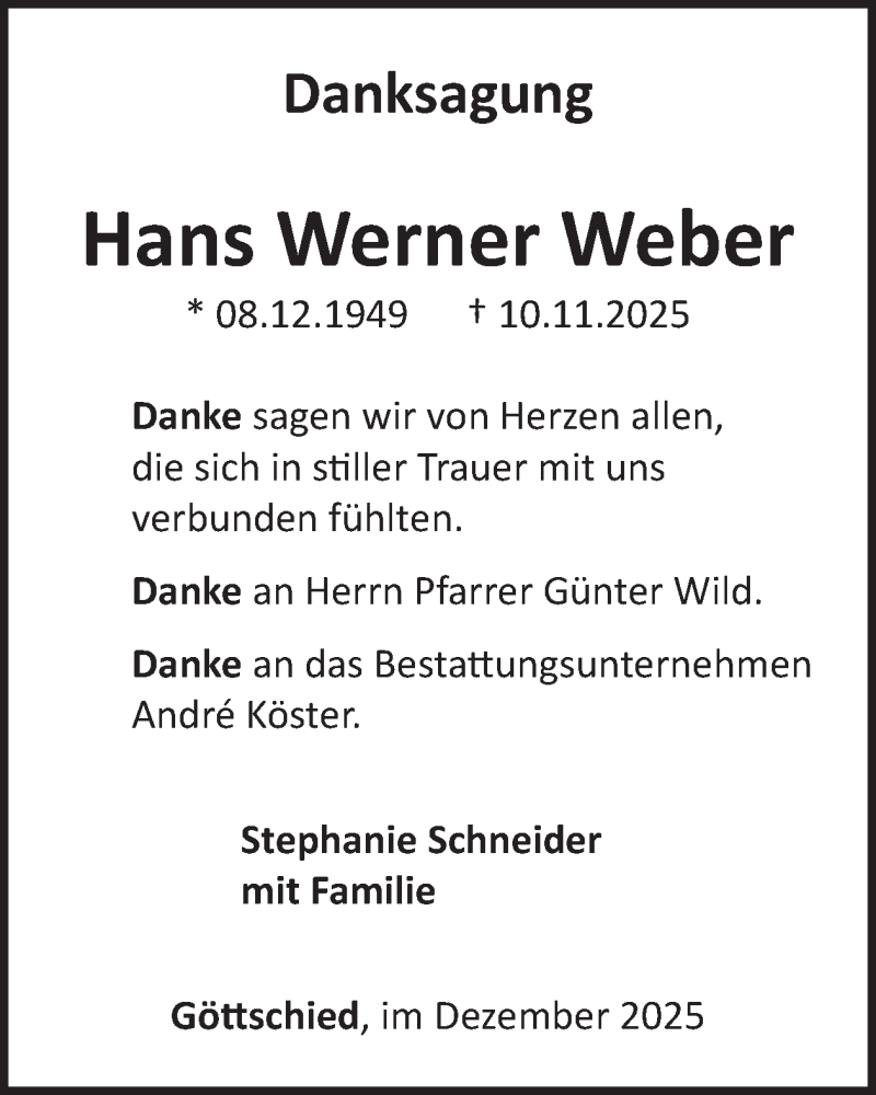 Hier finden Sie alle Traueranzeigen aus der Zeitung, die bisher für Hans Werner Weber erschienen sind. Weitere Traueranzeigen, die in der Zeitung erscheinen, werden hier ebenfalls aufgelistet