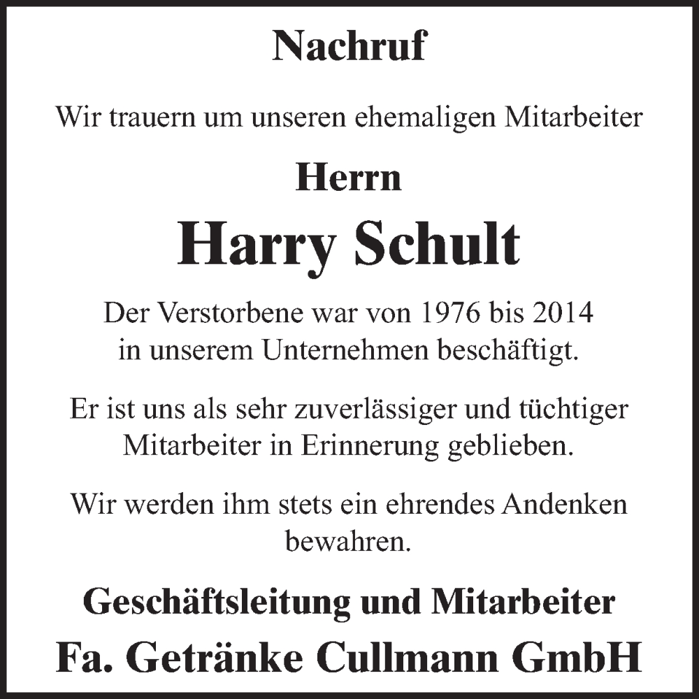 Hier finden Sie alle Traueranzeigen aus der Zeitung, die bisher für Harry Schult erschienen sind. Weitere Traueranzeigen, die in der Zeitung erscheinen, werden hier ebenfalls aufgelistet
