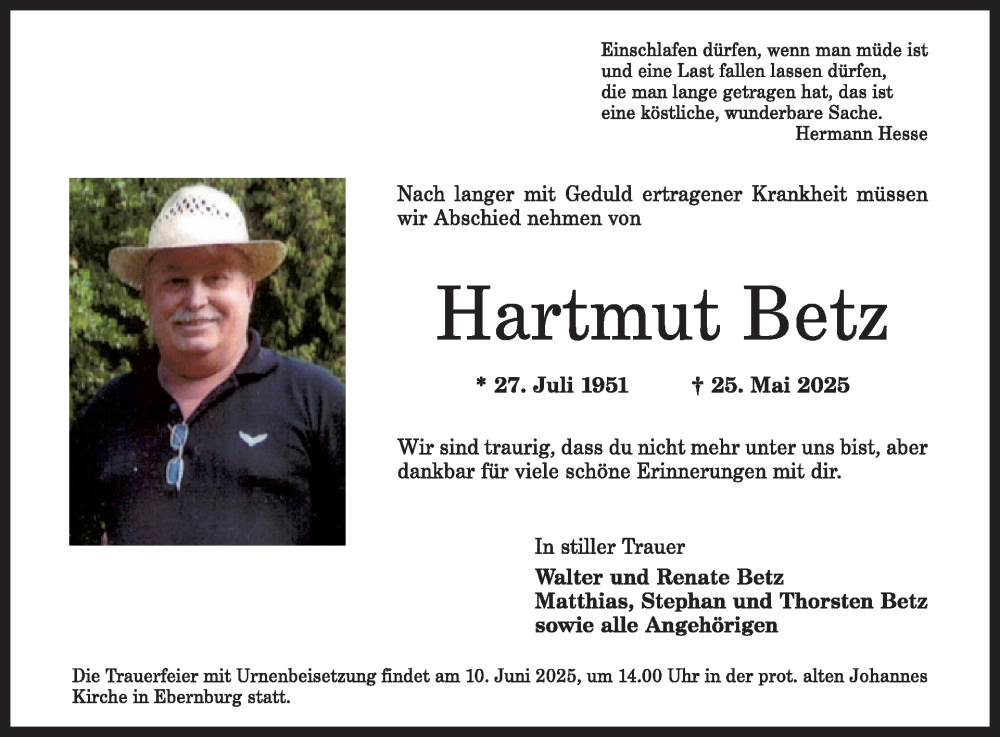 Hier finden Sie alle Traueranzeigen aus der Zeitung, die bisher für Hartmut Betz erschienen sind. Weitere Traueranzeigen, die in der Zeitung erscheinen, werden hier ebenfalls aufgelistet