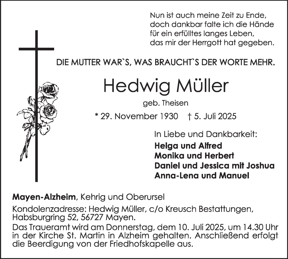 Hier finden Sie alle Traueranzeigen aus der Zeitung, die bisher für Hedwig Müller erschienen sind. Weitere Traueranzeigen, die in der Zeitung erscheinen, werden hier ebenfalls aufgelistet