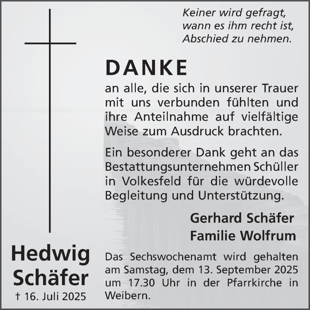 Hier finden Sie alle Traueranzeigen aus der Zeitung, die bisher für Hedwig Schäfer erschienen sind. Weitere Traueranzeigen, die in der Zeitung erscheinen, werden hier ebenfalls aufgelistet