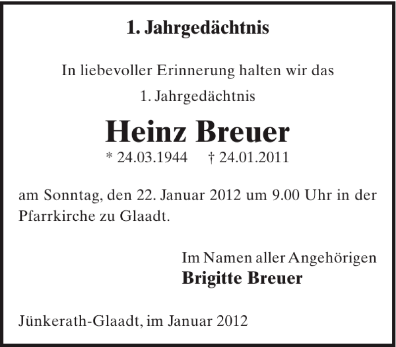 Hier finden Sie alle Traueranzeigen aus der Zeitung, die bisher für Heinz Breuer erschienen sind. Weitere Traueranzeigen, die in der Zeitung erscheinen, werden hier ebenfalls aufgelistet