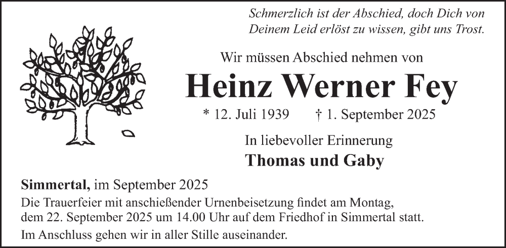 Hier finden Sie alle Traueranzeigen aus der Zeitung, die bisher für Heinz Werner Fey erschienen sind. Weitere Traueranzeigen, die in der Zeitung erscheinen, werden hier ebenfalls aufgelistet