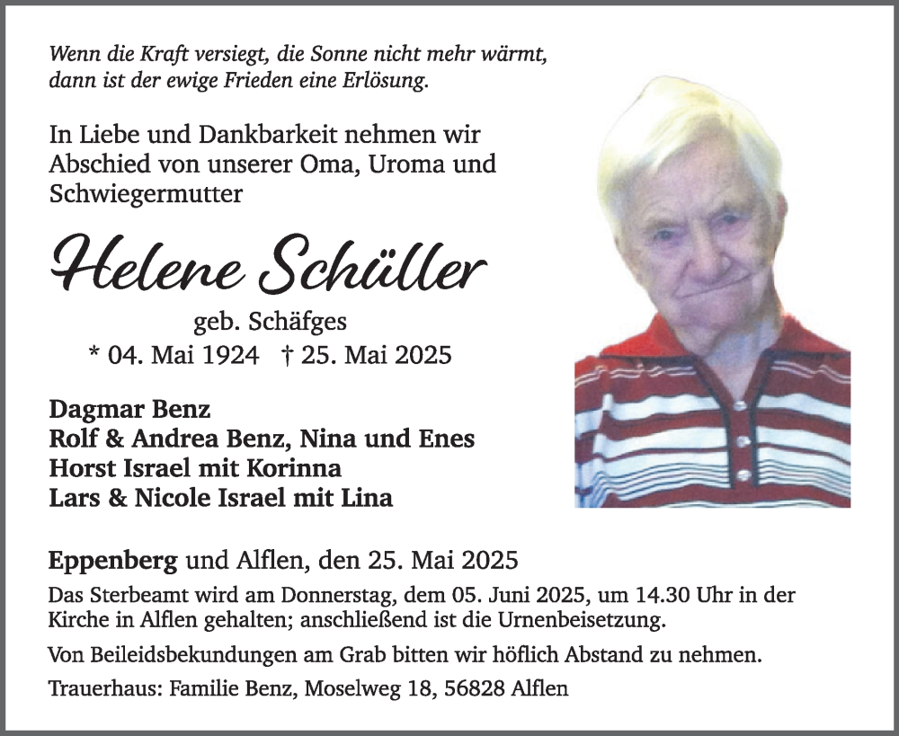 Hier finden Sie alle Traueranzeigen aus der Zeitung, die bisher für Helene Schüller erschienen sind. Weitere Traueranzeigen, die in der Zeitung erscheinen, werden hier ebenfalls aufgelistet