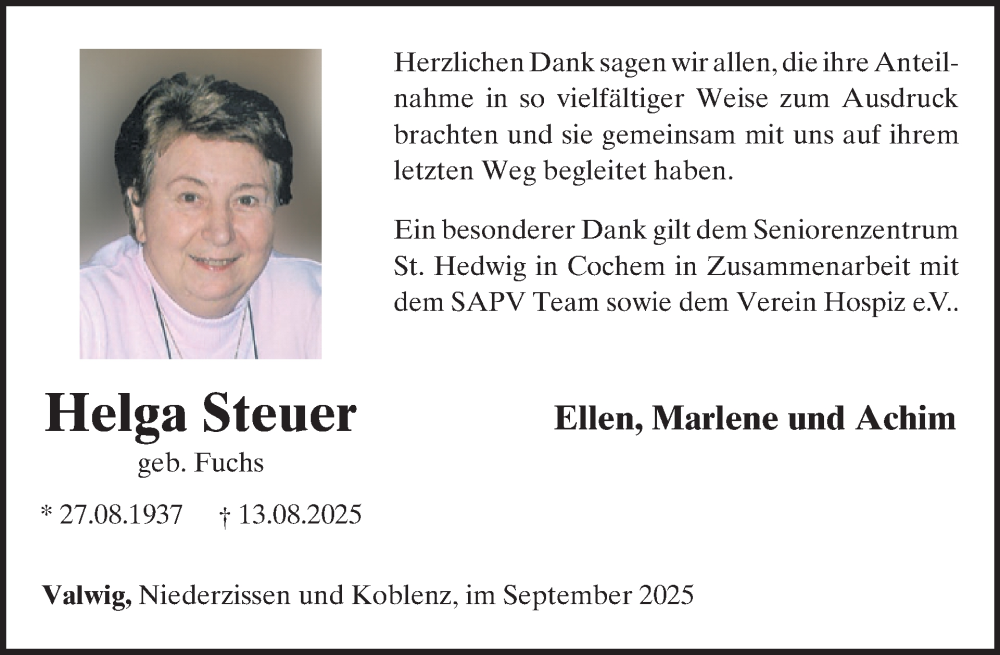 Hier finden Sie alle Traueranzeigen aus der Zeitung, die bisher für Helga Steuer erschienen sind. Weitere Traueranzeigen, die in der Zeitung erscheinen, werden hier ebenfalls aufgelistet