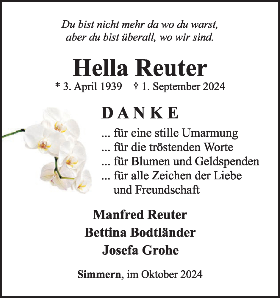Hier finden Sie alle Traueranzeigen aus der Zeitung, die bisher für Hella Reuter erschienen sind. Weitere Traueranzeigen, die in der Zeitung erscheinen, werden hier ebenfalls aufgelistet