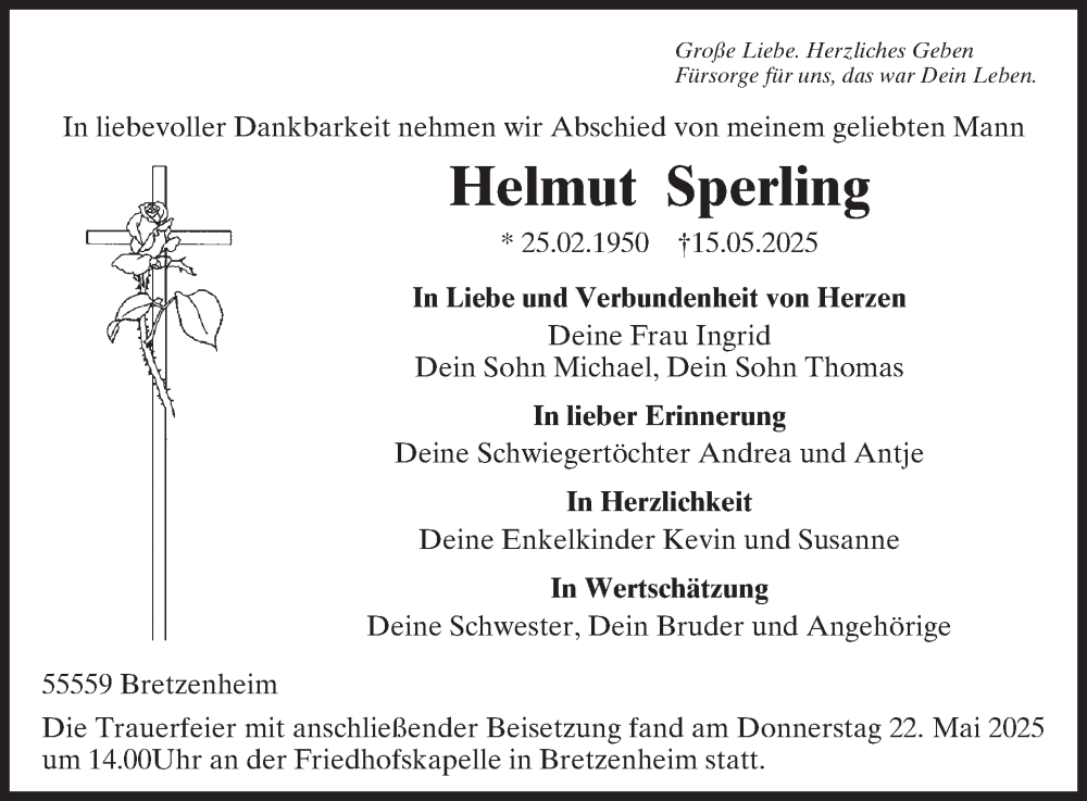 Hier finden Sie alle Traueranzeigen aus der Zeitung, die bisher für Helmut Sperling erschienen sind. Weitere Traueranzeigen, die in der Zeitung erscheinen, werden hier ebenfalls aufgelistet
