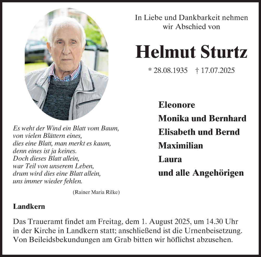 Hier finden Sie alle Traueranzeigen aus der Zeitung, die bisher für Helmut Sturtz erschienen sind. Weitere Traueranzeigen, die in der Zeitung erscheinen, werden hier ebenfalls aufgelistet