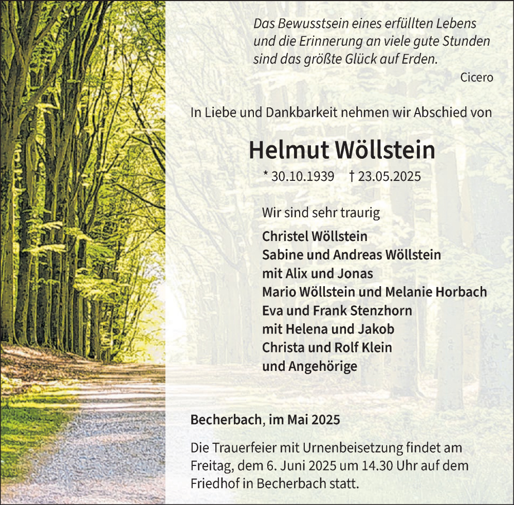 Hier finden Sie alle Traueranzeigen aus der Zeitung, die bisher für Helmut Wöllstein erschienen sind. Weitere Traueranzeigen, die in der Zeitung erscheinen, werden hier ebenfalls aufgelistet