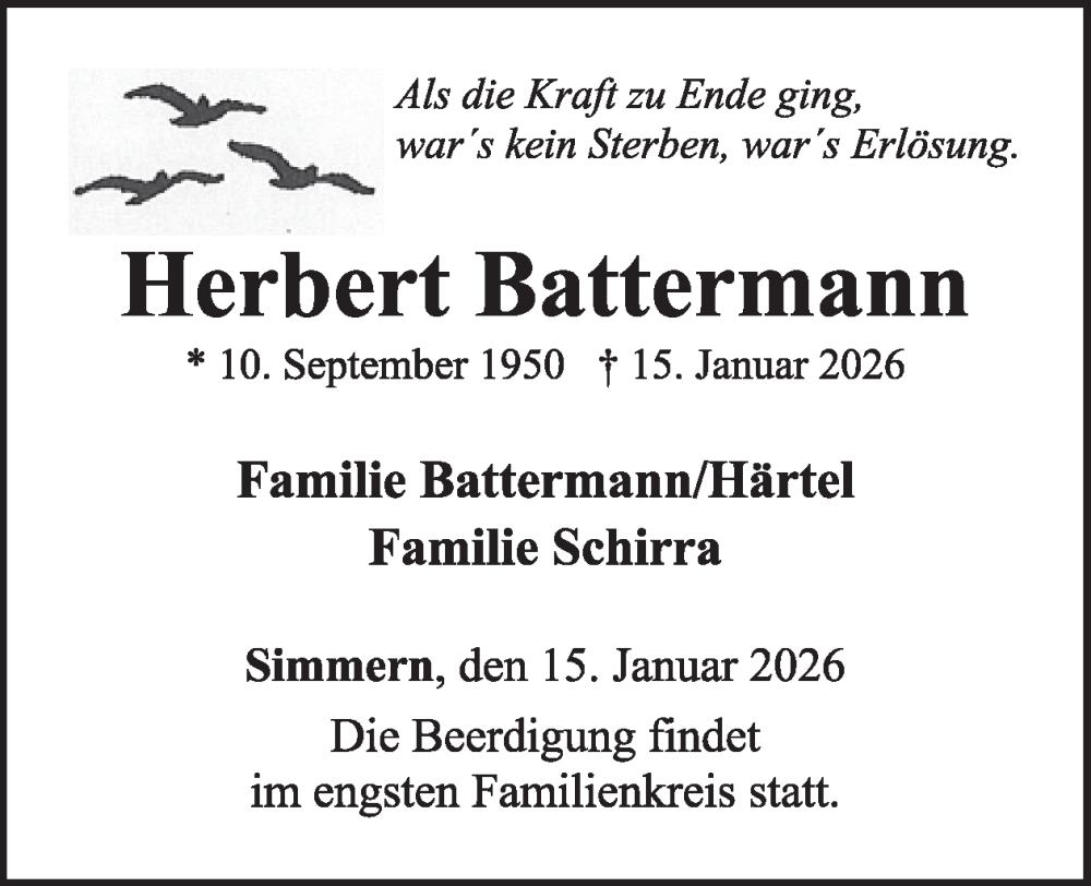 Hier finden Sie alle Traueranzeigen aus der Zeitung, die bisher für Herbert Battermann erschienen sind. Weitere Traueranzeigen, die in der Zeitung erscheinen, werden hier ebenfalls aufgelistet